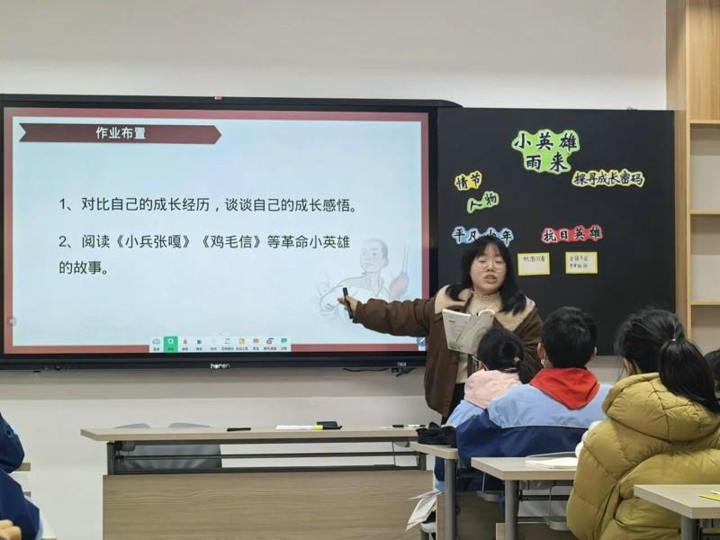 吕珏老师与六(1)班同学共读交流《小英雄雨来》,通过插图猜故事、串标题理情节等趣味活动,有效激活学生阅读记忆,着力培养学生图文结合的解读能力与小组合作梳理能力。课堂上,吕老师引导学生梳理人物关系、绘制雨来成长导图,帮助学生清晰厘清主人公的成长脉络,并结合文本细节,深入分析人物形象,感受精神力量。